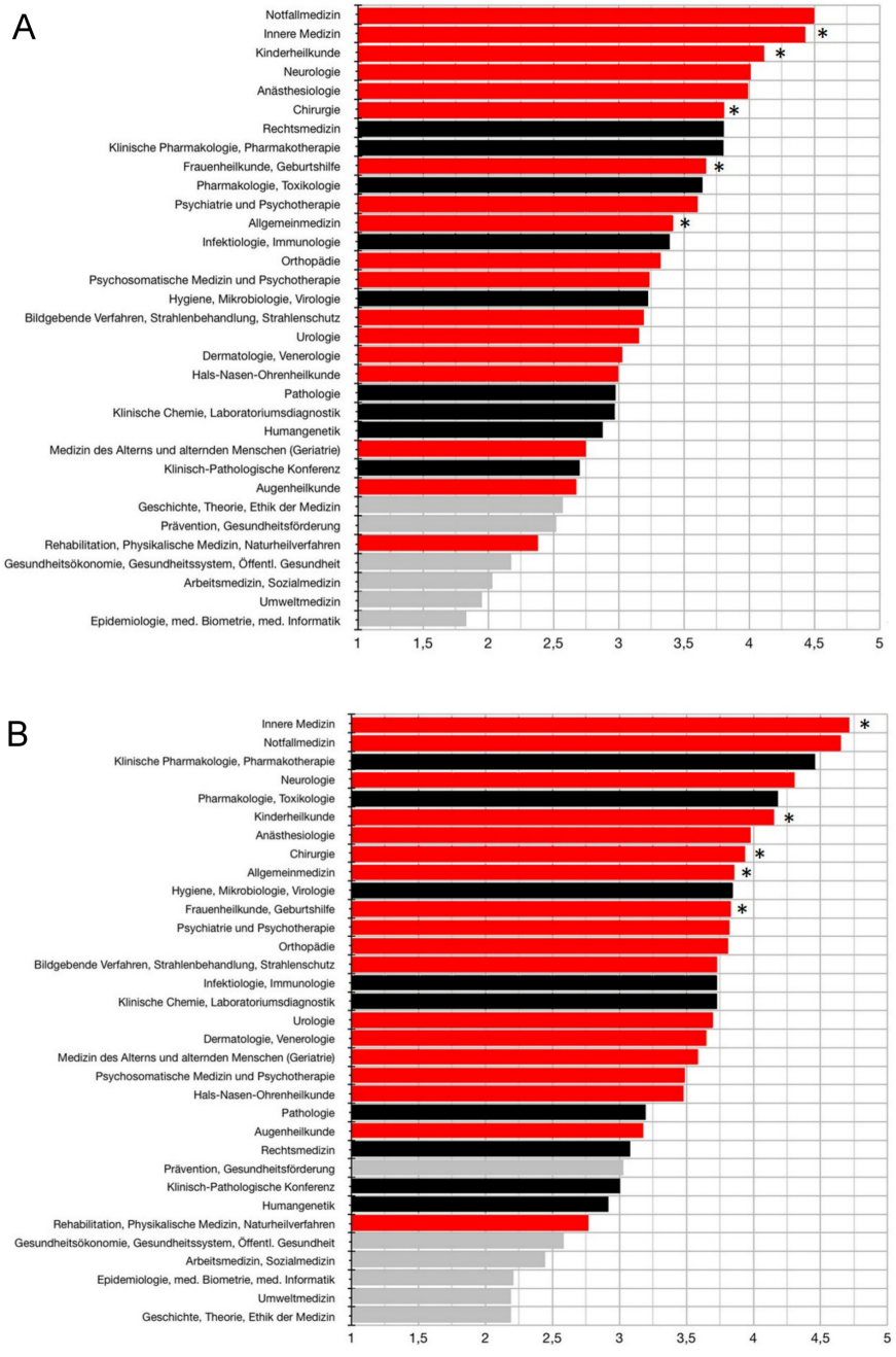 Abbildung 3: Darstellung der Einschätzung der eigenen Motivation, für eine Disziplin zu lernen (A) und der Bewertung der Nützlichkeit einer Diziplin (B). Klinisch-praktische (rot), klinisch-theoretische (schwarz) und sozioökonomisch orientierte (grau) Disziplinen des klinschen Studienabschnitts gemäß ÄApprO. Die Bewertung erfolgte anhand einer Likert-Skala (von 1=nicht interessant bis 5=sehr interessant bzw. 1=gar nicht nützlich bis 5=sehr nützlich). Dargestellt sind die jeweiligen Mittlerwerte. *: Blockpraktikumsfächer gemäß ÄApprO.