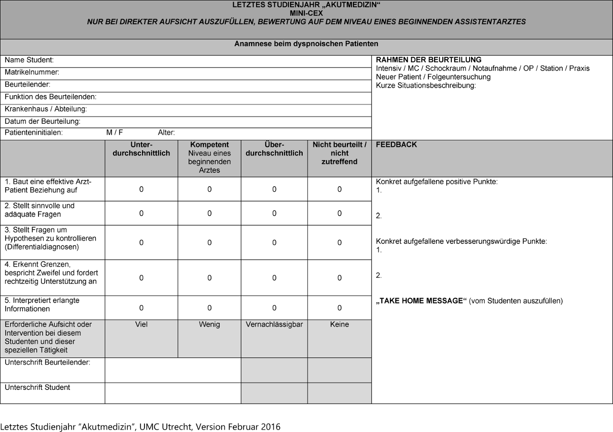 Arbeitsplatzbasierte Beurteilungen unseres DTY sind an die APT angepasst. Das DTY-Team entwickelte gemeinsam Mini-CEXs (Clinical Evaluation Exercises), um beurteilbare Tätigkeiten die Teil der APT sind abzudecken (z.B. „Anamnese beim dyspnoischen Patienten“, siehe Tabelle 1 [Tab. 1]). Diese spezifischen, kurzen klinischen Beurteilungen ergänzen die allgemeinen Beurteilungen, die im Masterabschnitt des Medizinstudiums am UMC Utrecht üblich sind, und lenken die Aufmerksamkeit von Studenten und Begleitern auf die Lernziele des DTY. Die Studenten dokumentieren ihre erhaltenen Beurteilungen in einem Portfolio, welches in naher Zukunft durch eine elektronische Version ersetzt wird.