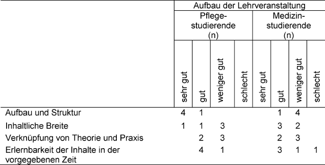 Aus Sicht beider Studierendengruppen konnten die Lerninhalte überwiegend in der vorgegebenen Zeit erlernt werden. Die Verknüpfung von Theorie und Praxis ist dabei nur aus Sicht von vier Studierenden (n=2 Pflege, n=2 Medizin) gut gelungen (siehe Tabelle 1 [Tab. 1]).