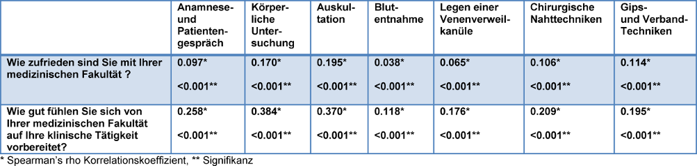 Geringe bis moderate Korrelationen fanden sich zwischen Beurteilung der Ausbildung in den erfragten Fertigkeiten und der selbsteingeschätzten Beherrschung derselben.