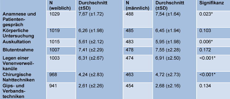 Abbildung 2 [Abb. 2] zeigt den Vergleich zwischen den Selbsteinschätzungen von weiblichen und männlichen Medizinstudenten in den erfragten klinischen Fähigkeiten. Auf die Frage „Wie gut fühlen Sie sich von ihrer medizinischen Fakultät auf die klinische Tätigkeit vorbereitet?“ antworteten männliche Studenten mit 4.99±2.11 und weibliche Studentinnen mit 4.72±2.19 (p=0.008) (siehe Tabelle 3 [Tab. 3]).