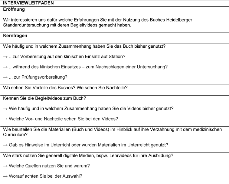 Die qualitative Untersuchung der Nutzungserfahrungen und der Bewertung der Lehrmaterialien durch die PJ-Studierenden erfolgte anhand von halbstandardisierten Interviews. Die Leitfragen für die Interviews wurden dabei anhand der Qualitätskriterien der COREQ-Checkliste [12] und auf Grundlage von Diskussionen im Expertenteam entwickelt. Unter Berücksichtigung der methodischen Anhaltspunkte nach Helfferich wurden die Interviews dabei in semi-standardisierter Form mit offenen Leitfragen (siehe Tabelle 1 [Tab. 1]), aufrechterhaltenen Fragen und Nachfragen entwickelt [13].