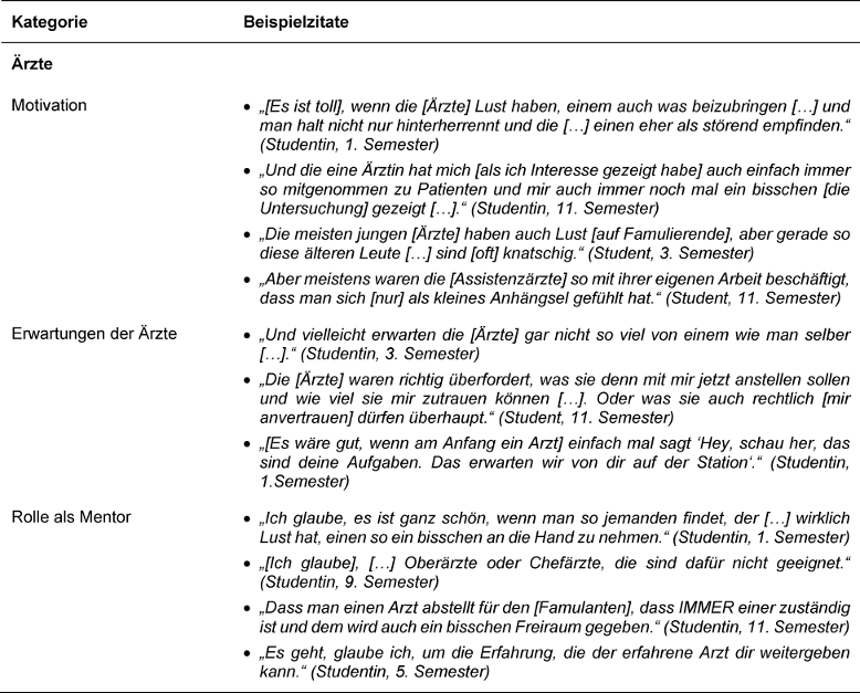 Mit Bezug zu den Ärzten konnten drei Subkategorien identifiziert werden, die einen Einfluss auf das SOL der Famulierenden aufwiesen: die Motivation der Ärzte, ihre Erwartungen an die Famulierenden sowie ihre Rolle als Mentor (siehe Tabelle 2 [Tab. 2]). Als motiviert erlebte Ärzte erhöhen bei den Famulierenden das SOL und damit den Lernerfolg einer Famulatur. Die Motivation zu lehren wird von den Studierenden der ärztlichen Arbeitsbelastung, ärztlichen Persönlichkeitsmerkmalen und ihrer Stellung in der Krankenhaushierarchie zugeschrieben. Dass die Ärzte Erwartungen an die Famulierenden formulieren, wünschen sich die Studierenden, um ihr SOL zu organisieren und sich nicht durch Unsicherheit in ihrem Lernprozess gehemmt zu fühlen. Oft seien die betreuenden Ärzte sich auch nicht darüber im Klaren, was generell die Aufgaben eines Famulierenden seien, was den Lernprozess behindern kann. Die Famulierenden wünschen sich einen ärztlichen Mentor, der ihr SOL in der Famulatur begleitet und Freude an der Lehre hat. Sie halten jüngere Ärzte für eine solche Aufgabe für geeigneter und sehen in der Arbeitsbelastung der Ärzte ein Hindernis für erfolgreiches Mentoring. Erwartet werden von Mentoren in einer Famulatur Vorbildcharakter, Anleitung und verantwortliche Übertragung von dem Kenntnisstand der Famulierenden angemessenen Aufgaben, um das SOL der Famulierenden individuell zu fördern.