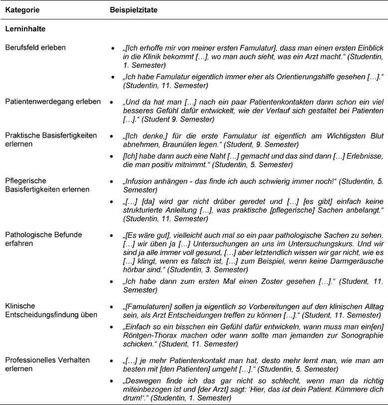 Insgesamt wurden sechs Fokusgruppeninterviews mit insgesamt 21 Studierenden (acht männlich, 13 weiblich) geführt. Das durchschnittliche Alter aller Teilnehmenden betrug 25,2±3,9 Jahre, 28,6% aller Teilnehmenden hatten noch gar keine Famulatur absolviert, 33,3% mindestens eine und 38,1% alle erforderlichen. Unter den Studierenden, die zum Untersuchungszeitpunkt bereits mindestens eine Famulatur absolviert hatten, waren die am häufigsten genannten Fachdisziplinen Innere Medizin (9), Allgemeinmedizin (8) und Radiologie (7).