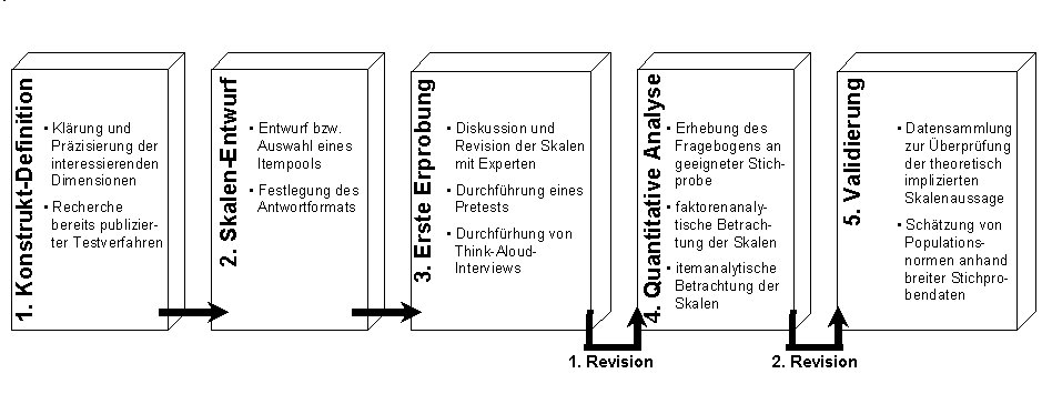 Die Konstruktion eines psychometrischen Fragebogens erfordert immer einen mehr-schrittigen Prozess, in dem sich Konstruktions-, Test- und Revisionsphasen ablösen. Abbildung 1 [Abb. 1] veranschaulicht dieses Vorgehen, wobei die klein gedruckten Konkretisierungen dem hier verfolgten Ansatz entsprechen, oftmals jedoch abweichenden Inhalts sein können. Die Erläuterung der Schritte 1-5 sind Gegenstand der folgenden Abschnitte.