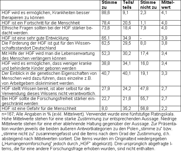 Allerdings zeigt sich über alle Befragten hinweg eine Sensibilität für vermeintlich kritische Aspekte. So wird auf die Möglichkeit genetisch basierter Diskriminierung verwiesen und die Mehrbeachtung ethischer Fragen gewünscht. Dies wird jedoch nicht mit der Forderung politischer oder juristischer Regulierung verbunden - stärkere Einschränkungen der Forschungsfreiheit werden für die Humangenomforschung mehrheitlich abgelehnt. Tendenziell wird statt dessen die Eigenverantwortung der Wissenschaft betont, die dafür zuständig sei, für von ihr bereitgestelltes Wissen auch die Verwendungsverantwortung zu übernehmen (Tabelle 1 [Tab. 1]).