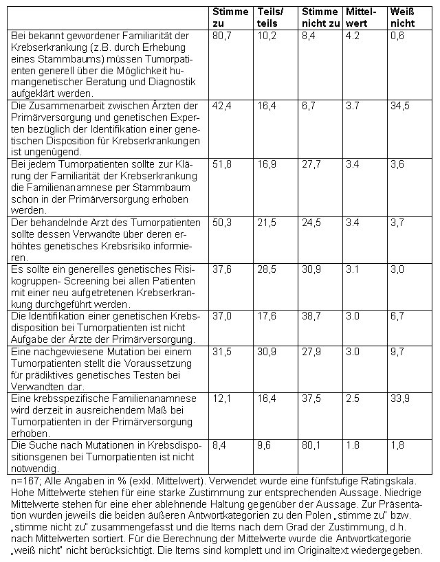 2) zur Bedeutung genetischer Diagnostik bei Krebspatienten als einem Anwendungsfeld, in dem humangenetische Erkenntnisse Auswirkungen auf die klinische Versorgung haben (9 Items);