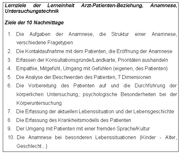 In der Klinik soll der Studierende Kompetenzen erwerben, die Grundwissen, kognitiv und emotiv (Sachebene, teils Übertragungsebene), soziale und interaktive Fertigkeiten (Abhängigkeitsebene), Selbstreflexionsfähigkeit (Empathiefähigkeit, Arbeitsbündnis) und Handlungskompetenz (auf Basis gesicherter Entscheidungsgrundlagen) betreffen. Der Student soll in der Arzt-Patient-Begegnung unterscheiden lernen, welche Kommunikationsanteile Sachinformation, welche Information über den Aktualzustand (emotional, intentional, intellektuell) und welche über die Art der Interaktionsgestaltung des Patienten eine Rolle spielen. Die erschwerten Umstände, worunter wir beispielsweise Zeitmangel, Unterbrechungen und schwierige Patienten rechnen, dienen vorab dazu, diese einzelnen Parameter modellhaft erkennbar zu machen und in der Interaktion eine Handlungskompetenz zu erreichen.