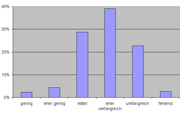 Die prozentuale Verteilung zeigt, dass über die Hälfte aller Befragten ihre Kenntnisse als "umfangreich" und immer noch fast ein Drittel als "mittel" einstufen. Ein kleiner Prozentsatz (6,8%) empfindet die eigenen Kenntnisse als "gering". Diese Frage wurde von 2,79% der Probanden nicht beantwortet.