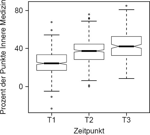Zusammenfassend zeigt die vorgestellte Analyse, dass durch Einführung des PTM ein Beitrag zur Evaluation eines Curriculums bezüglich nachhaltig vermittelten Fachwissens möglich ist. Am Beispiel der Inneren Medizin wurde dargestellt, dass das nachhaltige Wissen kontinuierlich und in Abhängigkeit von den praktischen Erfahrungen der Studierenden im klinischen Studienabschnitt zunimmt. An anderer Stelle konnten Defizite des Curriculums dokumentiert werden. Mittels wiederholter Durchführung solcher Querschnittanalysen können die Effekte erfolgter Curriculumsveränderungen evaluiert werden.