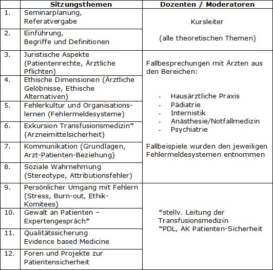 Der Umgang mit Unerwünschten Ereignissen in der medizinischen Behandlung und ihre Vermeidung erfordern Wissen und Erfahrung, aber auch Intuition und entsprechende persönliche Einstellungen. Das beschriebene Lehrprojekt trägt diesen Erfordernissen mit medizinischen, sozialpsychologischen und organisationssoziologischen Themen, und mit einer engen Verknüpfung von theoretischen Inhalte und klinisch-praktischen Erfahrungen, Rechnung.