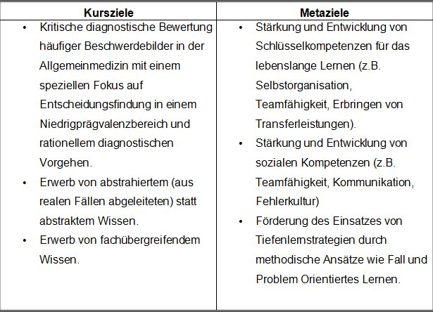 Durch den Einsatz verschiedener Moderationstechniken, Gruppenübungen, Fallvignetten, Simulationspatienten und Modellen des Marburger Interdisziplinären Skills Lab (MARIS), ergänzt durch Kurzpräsentationen und Diskussionen und strukturiertes Feedback sollten neben dem Erwerb differentialdiagnostischer Fachkompetenz weitere Schlüsselkompetenzen entwickelt und gefördert werden (siehe Tabelle 1: Kursziele und Metaziele [Tab. 1]).