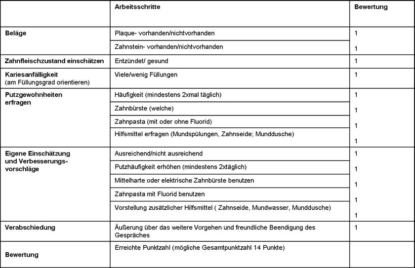 Ergebnisse: Die Interventionsgruppe war in folgenden Items signifikant besser als die Kontrollgruppe: in der erreichten Gesamtpunktzahl für das OSCE- Früher Patientenkontakt, sowie in den wichtigsten Punkten der Anamnese und der klinischen Untersuchung. Tendenziell zeigte die Experimentalgruppe zusätzlich bezüglich des Items „Mundhygienestatus“ höhere Rangwerte.