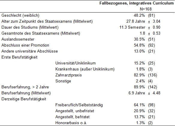Im Rahmen einer standarisierten Untersuchung in Anlehnung an das unabhängige Centre of Higher Education Development (CHE, Deutschland) wurden 404 Absolventen, die zwischen 1990 und 2006 das Patienten-bezogene, fallbezogene zahnmedizinische Curriculum (Universität Witten/Herdecke, Deutschland) erfolgreich abgeschlossen hatten, befragt [15], [16].