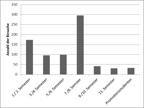 Das Skills Lab wurde im Februar 2013 eröffnet und steht seither den Studierenden während des Semesters und in der semesterfreien Zeit zur Verfügung. Erste Auswertungen der Nutzung und der Besucherzahlen innerhalb der Monate März bis September 2013 zeigen mit 769 Besuchen der Lernstationen ein großes und semesterübergreifendes Interesse an einem fakultativen Lernangebot im Skills Lab an der TiHo Hannover (siehe Abbildung 2 [Abb. 2]). Studierende des 7./8. Semesters bilden die größte Gruppe, da sie in den nächsten Semestern im praktischen Jahr (im 9./10. Semester) tätig werden.
