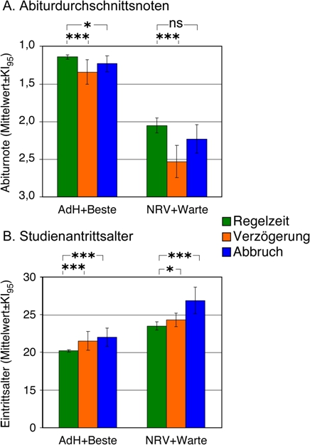 Die Studierenden der AdH- und Abiturbestenquote waren bei Studienbeginn durchschnittlich 20,5 Jahre, die Studierenden der NRV-Gruppe 22,3 Jahre alt. Die Studierenden der Wartezeitquote bildeten mit durchschnittlich 25 Jahren bei Studieneintritt eine deutlich ältere Gruppe (siehe Abbildung 1A [Abb. 1]).