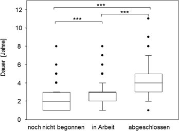 Ein weiterer Unterschied betrifft die Dauer der Promotion, wobei hier die Zeit von Beginn bis zur Verteidigung gemeint ist. Während sich (in Rostock) die Studierenden vor Beginn ihrer Promotion vorstellen, dass sie bis zur Verteidigung im Median 2 Jahre benötigen, korrigieren diejenigen, die aktuell an ihrer Promotion arbeiten, auf 3 Jahre nach oben. Tatsächlich aber dauerte die Promotion in der Gruppe der Promovierten vom Beginn bis zur Verteidigung im Median 4 Jahre. Diese Unterschiede sind für die drei befragten Gruppen signifikant (siehe Abbildung 1 [Abb. 1]). Alle weiteren Fragenitems zum zeitlichen Aufwand für und Einschränkung durch die Promotion ergeben keine signifikanten Unterschiede.