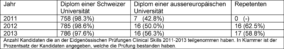 In einem ersten Schritt werden sämtliche Kommentare der Examinatoren gesichtet und gewertet sowie die Schwierigkeits- und Trennschärfewerte der einzelnen Beurteilungskriterien berechnet. Auf dieser Grundlage werden Kriterien, welche inhaltliche oder formale Mängel aufweisen, eliminiert. Anschliessend wird das Punktetotal eines Kandidaten an einer Station errechnet aus der Summe der gewichteten Checklistenpunkte der ASM Kriterien addiert mit der gewichteten Punktsumme der Kommunikationsskala (Punktetotal=0.75*ASM+0.25*KK). Die 12 Stationen tragen zum Prüfungstotal alle gleich bei. Das Prüfungstotal der Kandidaten berechnet sich als Mittelwert über die 12 Stationspunktetotale. Die Ergebnisse der Kandidaten werden anschliessend standardisiert, um die Prüfungsresultate über die drei Tage vergleichbar zu machen. In einem nächsten Schritt wird mittels der Borderline Regressionsmethode [12], [13] die Bestehensgrenze pro Station errechnet. Auf dieser Grundlage legt die Prüfungskommission die definitive Bestehensgrenze fest. Tabelle 1 [Tab. 1] zeigt die Anzahl Kandidaten gefächert nach Gruppen mit schweizerischem resp. aussereuropäischem Diplom und Repetenten sowie die entsprechenden Bestehensquoten.
