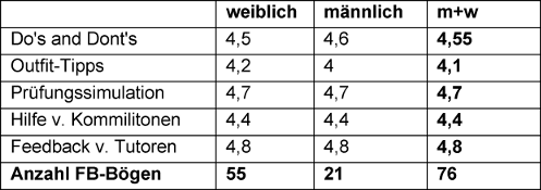 Die Listen mit „Do’s and Dont’s“ wurden mit einem Mittelwert von 4,55 als sehr hilfreich bewertet. Ebenfalls als hilfreich wurden die Tipps zum Outfit empfunden mit einem Mittelwert von 4,1. Die Simulation der Prüfungssituation wurde im Mittel mit 4,7, die Hilfe der Kommilitonen mit 4,4 und das Feedback der Tutoren mit 4,8 bewertet (siehe Tabelle 1 [Tab. 1]).