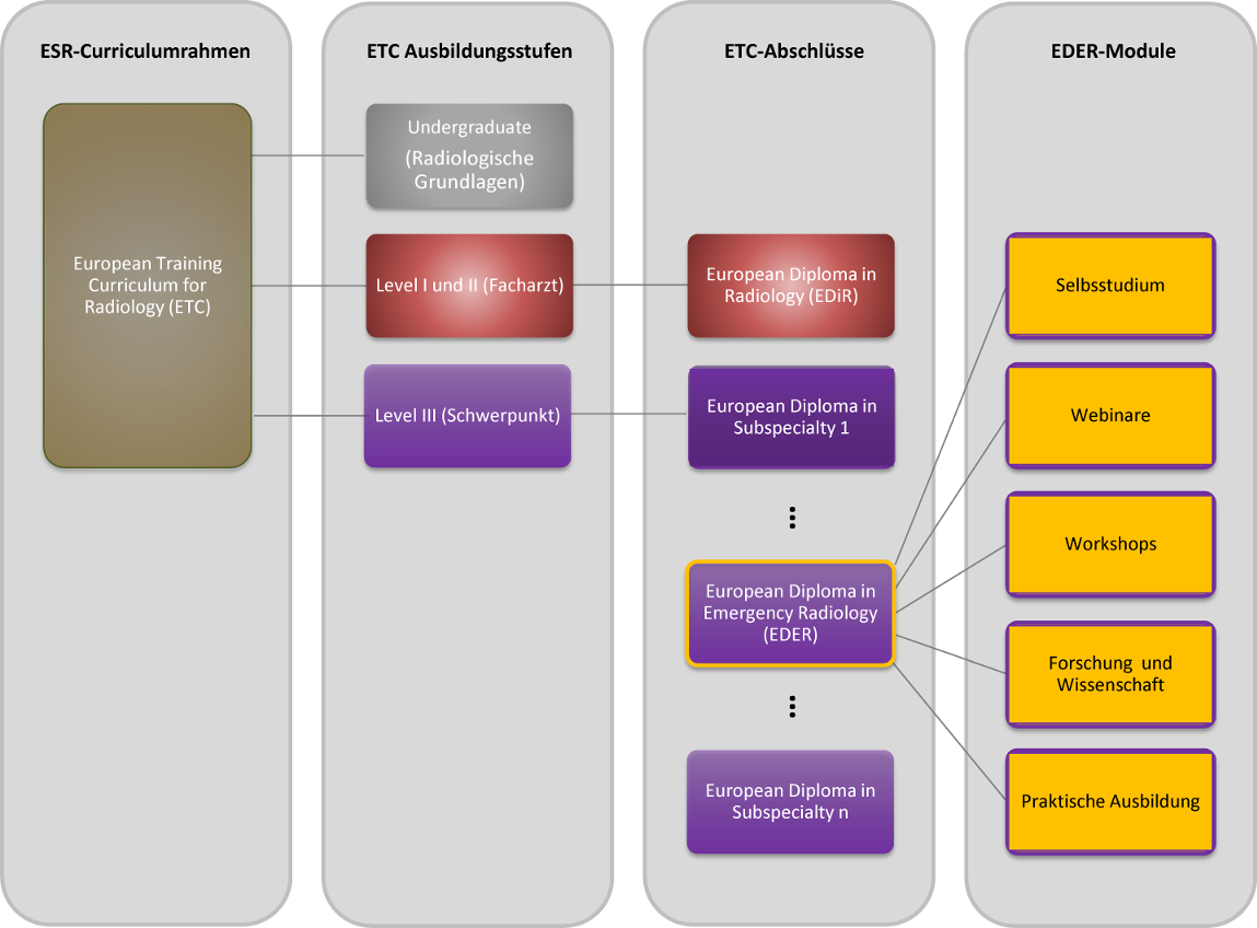 Obwohl ein nachvollziehbarer Bedarf besteht [7], bieten wenige europäische Länder zwar nationale Fachgesellschaften, aber keine geregelte Subspezialisierung in Notfallradiologie an. Stattdessen wird dies als im Rahmen der allgemeinen radiologischen Weiterbildung als ausreichend abgedeckt gewertet. In der Tat ist aufgrund der Häufigkeit von Notfällen und in Abhängigkeit von der Berufserfahrung auch immer eine gewisse Notfallkompetenz vorhanden und es gibt in allen Ländern auch ohne Qualifikationsnachweis entsprechende Expertinnen und Experten. In den USA ist ein geregelter Kompetenzerwerb und vor allem eine Nachweismöglichkeit hierfür gegeben [8] und dies erscheint auch in Europa erstrebenswert. Die ESR, deren Vorgaben auf nationaler Ebene empfehlenden Charakter haben, hat diesen Bedarf erkannt und deshalb die ESER nicht nur beauftragt ein Curriculum zur Subspezialisierung in Notfallradiologie zu entwickeln sondern hierbei auch das Angebot eines eigenen European Diploma in Emergency Radiology (EDER) nachdrücklich angeregt. Die ESR stellt hierfür ein laufend aktualisiertes, dreiteiliges European Training Curriculum (ETC, siehe Abbildung 1 [Abb. 1]) bereit, welches als Blaupause für die grundsätzliche radiologische Weiterbildung (Level I als Common Trunk und Level II mit Facharztniveau) und für optionale Spezialisierungen (Level III) genutzt werden kann und soll [9], [10], [11].