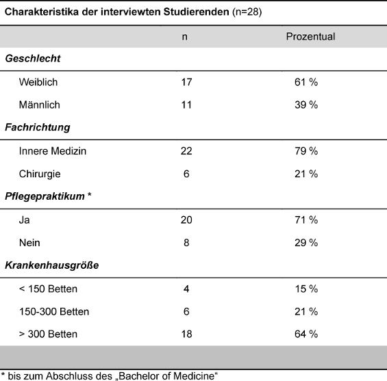 Von 92 Studierenden, die die grundsätzlichen Einschlusskriterien erfüllten, antworteten 42 auf die Einladung. Da wir lediglich 30 Interviews anstrebten, wurden keine Erinnerungsschreiben zur weiteren Teilnehmerrekrutierung verschickt. 34 Interviews konnten dann geführt werden. Davon wurden die ersten drei zur Pilotierung und Verfeinerung des Interviewleitfadens verwendet. Von den übrigen 31 Interviews mussten zwei ausgeschlossen werden, da die betreffenden Studierenden innerhalb der vorausgegangenen zwei Wochen ein neues Praktikum begonnen hatten.