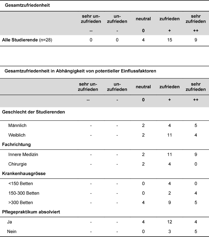 Die Gesamtzufriedenheit mit dem WSJ war hoch. Neun der 28 Befragten gaben an, „sehr zufrieden“ (++) zu sein, 15 waren „zufrieden“ (+), die übrigen vier Studierenden gaben „neutral“ (0) an (siehe Tabelle 2 [Tab. 2]). Es gab keinen ersichtlichen Zusammenhang im Hinblick auf Geschlecht oder Fachgebiet.