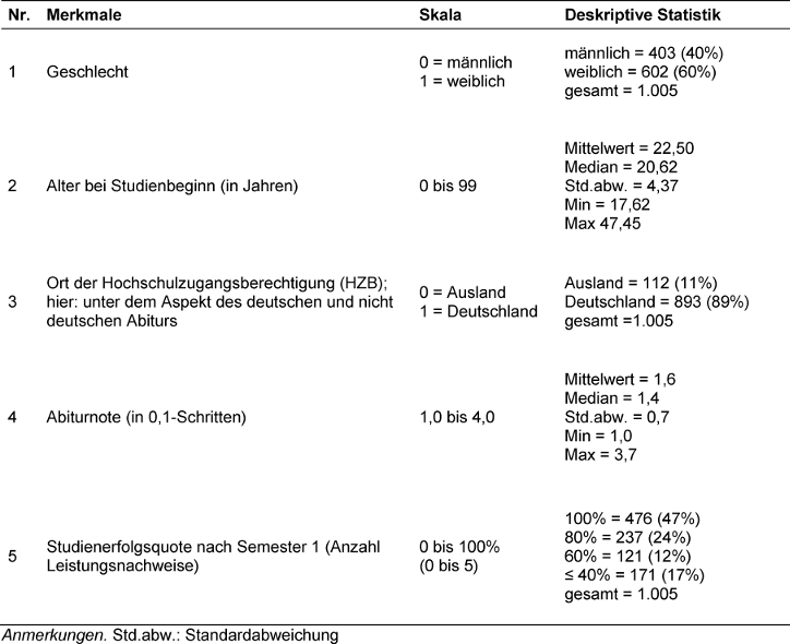 als Hinweis auf eine inländische oder ausländische Bildungsbiografie. Der Frauenanteil der gesamten Stichprobe liegt bei 60 % (602 Personen), was in etwa dem Frauenanteil der gesamten Studierendenschaft der Humanmedizin in Köln entspricht. Der Median des Alters bei Studienbeginn liegt bei 20,62 Jahren und der Mittelwert bei 22,5 Jahren. Von den 1.005 analysierten Studierenden haben 112 Personen (11%) ihre Hochschulreife im Ausland erworben. Da die Variablen 4 und 5 Informationen über die Ergebnisse der schulischen Ausbildung und auch über die universitären Leistungen im Studium liefern, stehen sie zudem beispielhaft und repräsentativ für die äußere Dimension der Ausbildung innerhalb des Diversitätsmodells und können unter dem Aspekt der vorliegenden Analyse verwendet werden. Der Mittelwert der Abiturnoten liegt bei 1,6 und der Median bei 1,4. Insgesamt haben knapp 60% der untersuchten Studierenden eine Abiturnote von 1,4 und besser. Beim Studienerfolg nach Semester 1 können etwas weniger als die Hälfte der untersuchten Studierenden einen hundertprozentigen Studienerfolg nach dem ersten Semester vorweisen (47%, n=476). 529 der Studierenden (53%) fehlt nach dem ersten Semester bereits mindestens ein Leistungsnachweis.