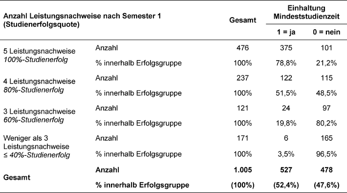 Es kann demnach festgehalten werden, je größer die Studienerfolgsquote nach dem ersten Semester, desto eher wird die Mindeststudienzeit eingehalten (siehe hierzu auch Tabelle 4 [Tab. 4]).