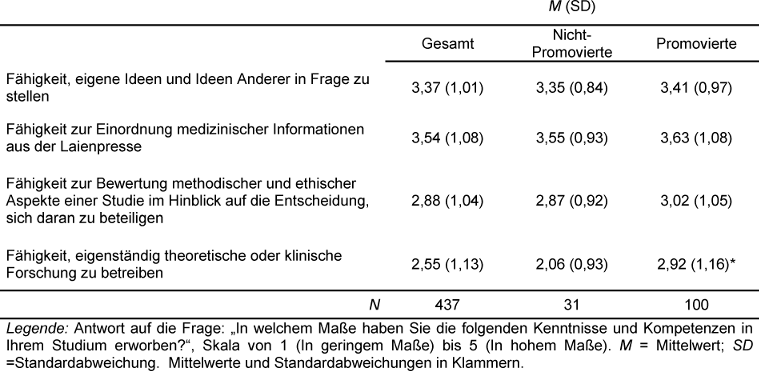 Im Einklang mit den qualitativen Ergebnissen fällt in den Daten des MediBAP die Bewertung der Kompetenz zum eigenständigen Forschen im Vergleich zu allgemeiner formulierten Kompetenzen, wie z.B. dem Einordnen von medizinischen Informationen aus der Laienpresse, auch für Promovierte eher niedrig aus – auch wenn diese sich, wie zu erwarten, signifikant besser als Nicht-Promovierte einschätzen.