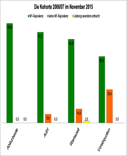 Neun Jahre nach Studienbeginn hatten alle Abiturbesten die M1-Äquivalenz im Modellstudiengang erworben. Auch in der Wartezeitgruppe hatten 84% der MHH-Studierenden diese Zwischenprüfung erfolgreich bestanden. Die über das AdH-Verfahren an der MHH zugelassenen lagen, wie bei den Abiturnoten, zwischen den beiden Gruppen, was diesen Zwischenschritt auf dem Weg zu einem erfolgreichen Studienabschluss anging. Lediglich bei den über Vorabquoten zugelassenen Studierenden entsprach der Anteil erfolgreich abgelegter Zwischenprüfungen nicht den Vornoten (siehe Abbildung 2 [Abb. 2]).
