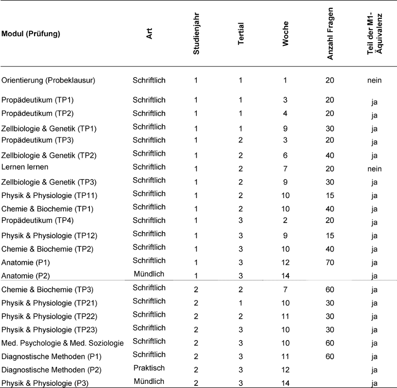 - Der erste Abschnitt der Ärztlichen Prüfung (M1) wird an der MHH nicht in einer großen schriftlichen und einer mündlich-praktischen Prüfung abgelegt, sondern wird kumulativ durch Bestehen aller Module der ersten beiden Studienjahre erworben. Dabei müssen alle in die Äquivalenz für M1 eingehenden Prüfungen separat bestanden werden. Ein endgültiges Nichtbestehen einer dieser Einzelprüfungen entspricht daher dem endgültigen Nichtbestehen der M1-Prüfung. Tabelle 1 [Tab. 1] skizziert diese separaten Prüfungen aus den ersten beiden Studienjahren hinsichtlich ihrer Positionierung im Studienverlauf. Durch die Integration der beiden Studienabschnitte können die Studierenden mit kleineren Einschränkungen aber im Studium voranzuschreiten, auch wenn sie noch nicht alle Teile der M1-Äquivalenz abgelegt haben. D.h. die Teilnahme an den Modulen der Studienjahre drei bis fünf setzt an der MHH nicht das Bestehen aller Module der ersten beiden Studienjahre voraus. Für alle von Heidmann et al. [1] ausgewertete Fakultäten gilt hingegen, dass die Studierenden erst dann Lehrveranstaltungen im klinischen Studienabschnitt besuchen dürfen, wenn Sie den ersten Abschnitt der Ärztlichen Prüfung (M1) erfolgreich abgeschlossen haben.
