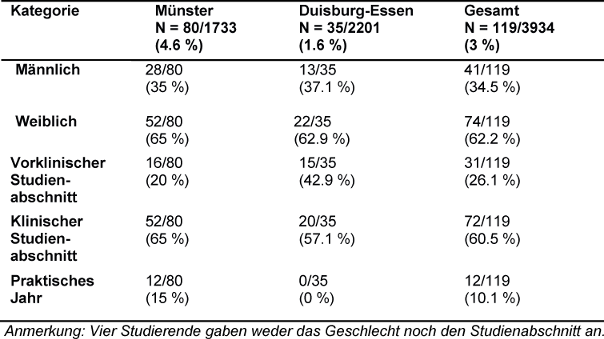 An der Umfrage nahmen 149 Studierende teil, davon waren 119 Studierende der Humanmedizin. Die Rücklaufquote betrug insgesamt 3.3% und für Humanmedizin 3%. Im Folgenden wird ausschließlich auf die Ergebnisse der humanmedizinischen Befragung eingegangen. Eine differenzierte Betrachtung der Stichprobe ist Tabelle 1 [Tab. 1] zu entnehmen. Von den Studierenden sind 67% (80/119) an der Universität Münster und 29% (35/119) an der Universität Duisburg-Essen immatrikuliert.