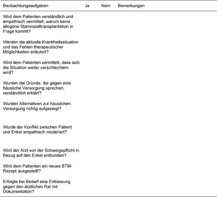Während der Bearbeitung der drei Fallszenarien in einem Simulationsdurchgang der „Ambulanzsimulation“ erhielten die Studierenden und der Dozent einen Beobachtungsbogen pro Fallszenario. Dieser enthielt jeweils