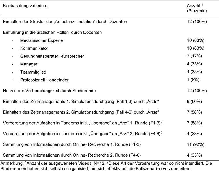 Für 12 Durchgänge der überarbeiteten „Ambulanzsimulation“ liegen Einverständniserklärungen der Studierenden und Dozenten vor, dass die Lehrveranstaltung gefilmt werden durfte. Die Aufzeichnungen sollten zeigen, ob während des Unterrichts ärztliche Rollen durch die Dozenten adressiert wurden und ob in den Fallszenarien die intendierten ärztlichen Rollen angesprochen wurden. Das Lehrformat wurde von sieben unterschiedlichen Dozenten geleitet. Zwei Dozenten waren erfahrene Dozenten, welche das Lehrformat von Beginn an begleitet hatten und auch an der Entwicklung der Fallszenarien beteiligt waren. Die anderen fünf Dozenten wurden in das Lehrformat eingeführt und übernahmen zu mindestens zwei Zeitpunkten die Durchführung.