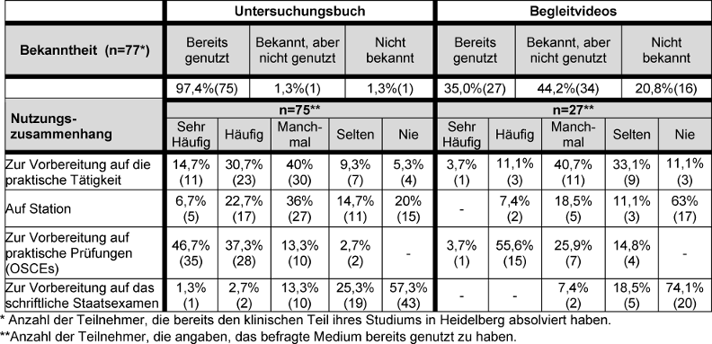 Fast alle PJ-Studierenden (97,4%), die den klinischen Teil ihrer Ausbildung in Heidelberg absolviert hatten, gaben an, das Handbuch bereits genutzt zu haben. Die große Mehrheit (85%) hatte das Buch regelmäßig für die Vorbereitung zu praktischen Prüfungen im klinischen Abschnitt ihres Studiums und dabei im Speziellen für die praktischen Prüfungen (OSCEs) [16] genutzt. Knapp die Hälfte der PJ-Studierenden gab ebenfalls an, das Buch auch häufig bis sehr häufig zuhause zur Vorbereitung für die Arbeit auf Station genutzt zu haben. Auf Station wurde das Buch von einem Drittel der Studierenden ebenfalls häufig genutzt. Für die Vorbereitung auf das schriftliche Staatsexamen hatten weniger als 20% das Buch verwendet (siehe Tabelle 2 [Tab. 2]).