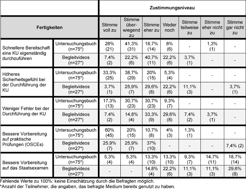 - Der Einfluss der Medien auf die Prüfungsvorbereitung und das Erlernen von klinisch-praktischen Fertigkeiten wurden ebenfalls mit siebenstufigen Likert-Skalen Fragen („stimme voll zu“ bis „stimme gar nicht zu“) für das Buch und die Videos bestimmt. Hierbei wurden jeweils drei Items bezüglich des praktischen Nutzens („größere Eigenständigkeit“, „höheres Sicherheitsempfinden“, „weniger Fehler bei der Untersuchung“) und je zwei Items zum Nutzen für die Prüfungsvorbereitung (Staatsexamen und praktische Prüfungen im Studium) abgefragt.