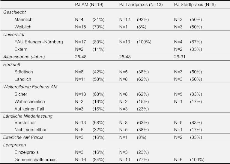 Eine ländliche Niederlassung war für insgesamt 13 TN vorstellbar (PJ Landpraxis: acht TN, PJ Stadtpraxis: fünf TN). Für sechs TN war dies nicht vorstellbar (PJ Landpraxis: fünf TN, PJ Stadtpraxis: eine TN). Hiervon präferierten drei TN die Niederlassung in der Stadt (PJ Landpraxis: zwei TN, PJ Stadtpraxis: eine TN) und weitere drei TN die Arbeit in einem anderen Fachgebiet (alle aus PJ Landpraxis). Nur zwei TN mit PJ Landpraxis entschieden sich letztendlich gegen eine Niederlassung auf dem Land. Eine TN aus privaten Gründen und die andere aufgrund bereits abgeschlossener Existenz- und Familiengründung. Eine Beschreibung der Stichprobe ist in Tabelle 1 [Tab. 1] dargestellt. Alle TN empfahlen das Wahltertial AM unabhängig von der späteren Fachgebietswahl für ihre Kommilitonen. Nur eine schränkt die Empfehlung auf an der AM interessierte Studierende ein. Der Einfluss der finanziellen Aufwandsentschädigung auf die Wahl einer Landpraxis wurde von den TN zwischen 0 und 50% angegeben.