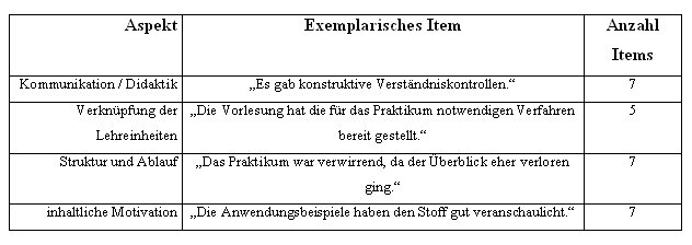 Tabelle 1: Aspekte des standardisierten Mainzer Fragebogens zur Bewertung der Lehre im Fach Medizinische Biometrie (Benennung des Aspekts, eines exemplarischen Einzelitems und der Anzahl der in diesen Aspekt einfließenden Items)