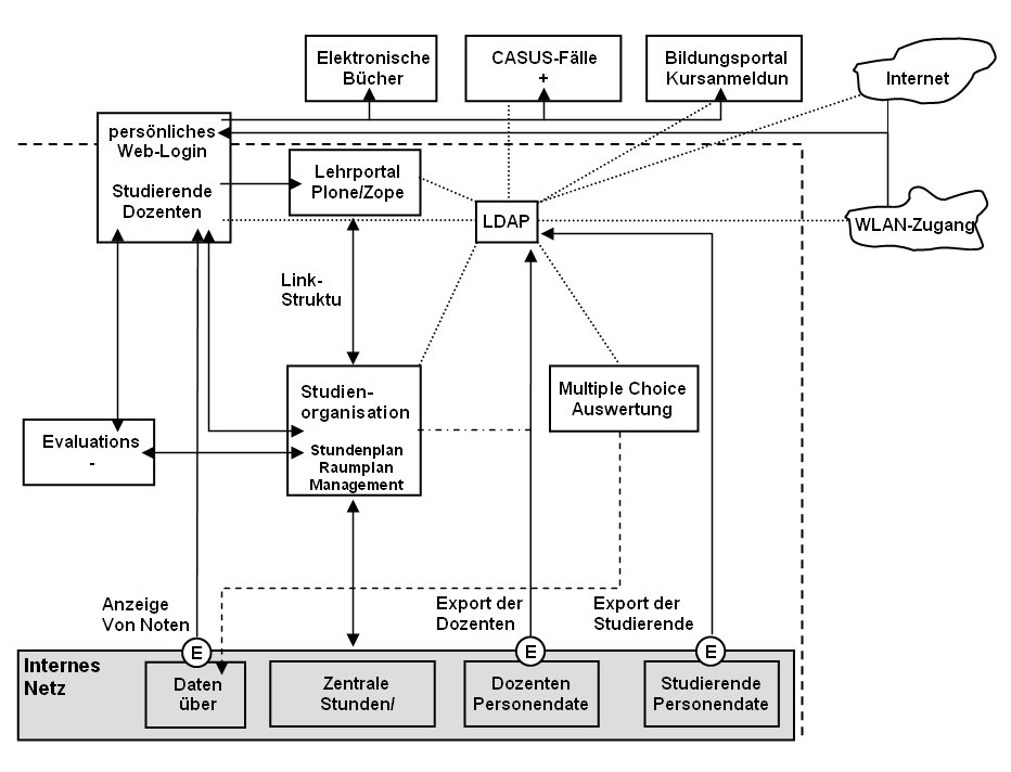 Das medInfo-System war trotz der guten Nutzbarkeit insbesondere durch eine fehlende Benutzerverwaltung limitiert, so dass im Jahr 2004 mit den Erfahrungen des medInfo-Projektes eine Neuentwicklung auf der Basis von OpenSource Produkten - dem Applikationsserver zope (http://www.zope.org) und dem Content-Management-System plone (http://plone.org) - angegangen wurde. Hier konnte in wenigen Monaten ein System (E- Portal) zum Einsatz gebracht werden, das die Einarbeitung von Lehrinhalten in einer einfachen und auf die Struktur und Bedürfnisse der Fakultät zugeschnittenen Form erlaubt. Zu großen Teilen wird dieses Lehrportal als zentraler Sammelplatz für Vorlesungsinhalte und Informationen zu den einzelnen Veranstaltungen genutzt, die dort in der Regel in Form von PDF oder Powerpoint Dateien abgelegt werden. HTML-Seiten können auch für Anwender ohne HTML-Kenntnisse mittels des WYSIWYG-Editors Epoz bequem im Webbrowser erstellt werden. Aufgrund der in zope/plone dedizierten Rechtvergabe für Lese- und Schreibzugriffe arbeiten viele Personen unabhängig voneinander bzw. zusammen in diesem System. Die Studierenden nutzen aktuell noch Gruppen-Logins, welche aber in den kommenden Monaten in individuelle Logins überführt werden. Als zentrale Instanz befindet sich ein LDAP-Server im Aufbau.