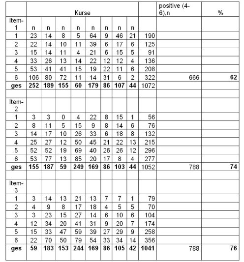 Befragt wurden Studenten aller Kurse des dritten bis fünften Studienjahres (1087). Dabei ist zu berücksichtigen, dass es sich um eine sich wiederholende studentische Klientel in drei Kursen des dritten, in zwei Kursen des vierten und in drei Kursen des fünften Studienjahres handelt. Einen großen Einfluss hatte des Weiteren das qualitativ und quantitativ unterschiedliche inhaltliche Angebot der einzelnen Kurse im E-Portal (siehe Tabelle 1 [Tab. 1]):
