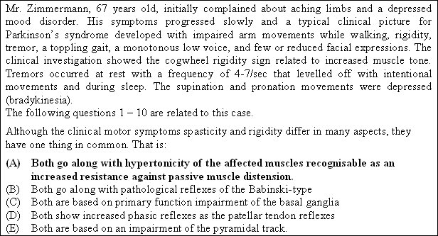 Figure 1: Example of context information: Case presentation of Parkinson´s disease and sample MC-question (correct answer in bold type).