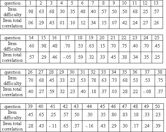 Table 1: Item difficulty level and item-total correlations for all 50 questions