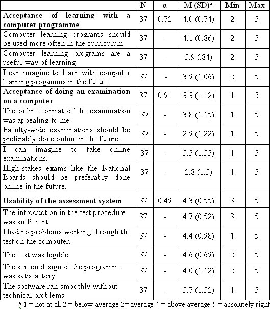 A questionnaire of twelve items was designed for this study, which the students filled out after having completed the examination. They were asked how they accept computer-based examinations, learning with computers, and the user friendliness (usability) of the system. The questions were answered on a 5-point Likert-scale, whereby 1 meant "not at all" and 5 meant "absolutely right".