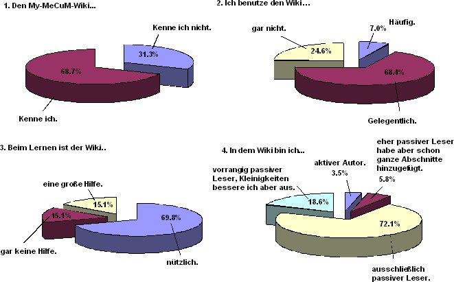 Ergebnisse: Eine Online-Bibliothek als Wiki ist die erste Lösung dieser Art an einer medizinischen Fakultät in Deutschland. Das Konzept konnte ohne wesentliche technische Probleme von studentischer Seite implementiert werden und ist an die offiziellen Internetseiten der Medizinischen Fakultät der Universität München angebunden. Im Zeitraum von Dezember 2005 bis Juni 2007 wurden die Inhalte des MeCuM-Wikis insgesamt 417.808 Mal aufgerufen. Eine Online-Evaluation zeigte, dass das Projekt positiv von den Studierenden aufgenommen wird und dass die Studierenden zur aktiven Teilnahme motiviert sind.