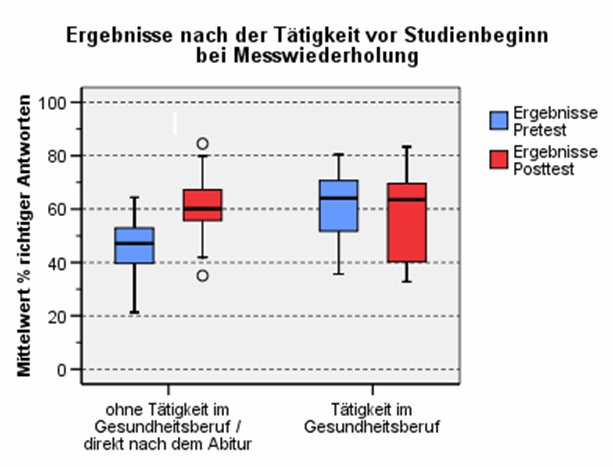 Ein zweites Ergebnis war der eindeutige Wissensvorsprung der Studierenden die vor Studienbeginn in Gesundheitsberufen tätig waren. Die Beobachtung, dass dieser nach in der Nachtestung nicht mehr nachweisbar war, ist nicht eindeutig zu interpretieren. Die Tatsache, dass zwischen dem Vorwissen der im ersten und im zweiten Semesterabschnitt den Kurs beginnenden Studierenden keine Unterschied festzustellen war, spricht hierbei gegen einen Einfluss der in der ersten Semesterhälfte besuchten naturwissenschaftlichen und theoretisch- medizinischen Lehrveranstaltungen und für den Lerneffekt des Kurses „Klinik für Vorkliniker“. Dies ist aber wegen der geringen Zahl der Testpersonen und der nicht auszuschließenden Erinnerungseffekte nicht beweisend.