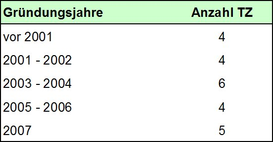Das älteste TZ im deutschsprachigen Raum wurde 1995 in Österreich gegründet, das jüngste im November 2007 in Deutschland (siehe Tabelle 2 [Tab. 2]).