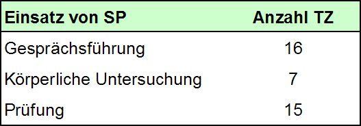 Tabelle 6: Einsatzgebiete von Simulationspatienten (SP); Mehrfachnennung möglich; n=24