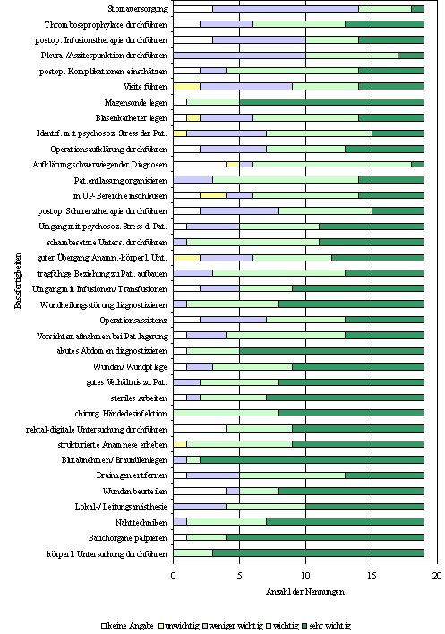 Als weniger wichtig bis unwichtig bezeichneten die Ärzte in erster Linie die Tätigkeiten, die sie sehr wenig aktiv lehrten, beispielsweise die Durchführung einer Stomaversorgung.