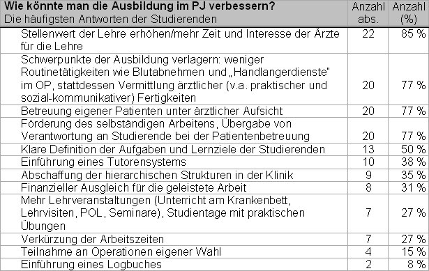 Einige Kritikpunkte bzw. Verbesserungsvorschläge wurden jeweils von allen drei (!) Berufsgruppen genannt. So waren viele Befragte einhellig der Meinung, dass die derzeitige Ausbildung während des Praktischen Jahres nicht ausreichte, um die Studierenden auf den späteren Beruf als Arzt vorzubereiten. Ebenso wurde bemängelt, dass für die Ausbildung im PJ klare Richtlinien und Lernziele fehlten und nicht ausreichend definiert sei, welche Aufgaben PJ-Studierende an ihren Einsatzorten tatsächlich haben. Viele Befragte aus allen drei Gruppen hielten es im Sinne einer praxisnahen Ausbildung für wünschenswert, dass die Studierenden in der Zeit auf Station kontinuierlich eigene Patienten betreuen sollten.