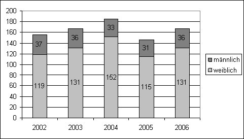 Dissertationen an tiermedizinischen Fakultäten unterscheiden sich, neben denen an medizinischen Fakultäten, deutlich von Promotionen anderer Fachbereiche. Es gibt zum einen erhebliche Unterschiede in der Dauer, im Umfang und auch in der Finanzierung einer Dissertation. Zum anderen ist die Anzahl der Promovierenden in Relation zu den Studierenden sehr hoch. Das Verhältnis der Promotionsstudenten, die ihre Promotion abschließen und der Studenten, die ihr Studium beenden, liegt bei über 80 Prozent. Somit kann davon ausgegangen werden, dass ein Großteil der Tiermedizinstudenten eine Promotion anfertigen. An der TiHo beläuft sich momentan die Gesamtzahl der eingeschriebenen Promotionsstudenten einschließlich der beiden PhD-Studiengänge auf ungefähr 700, wobei die Gesamtzahl der Promovierenden allein circa 600 beträgt. Dabei hat sich in den letzten Jahren die Anzahl der Promotionsstudenten, die ihre Promotion beendeten nicht wesentlich geändert (siehe Abbildung 2 [Abb. 2]). Die Anzahl der Promovendi lag im Mittel bei 164, und setzte sich durchschnittlich aus 129 weiblichen und 35 männlichen Absolventen zusammen. Bei einer durchschnittlichen Gesamtzahl der Promotionsstudenten von 600 und einer mittleren Anzahl der Promovendi von 164 ergäbe sich eine durchschnittliche Promotionszeit von ungefähr 3,5 Jahren an der TiHo.